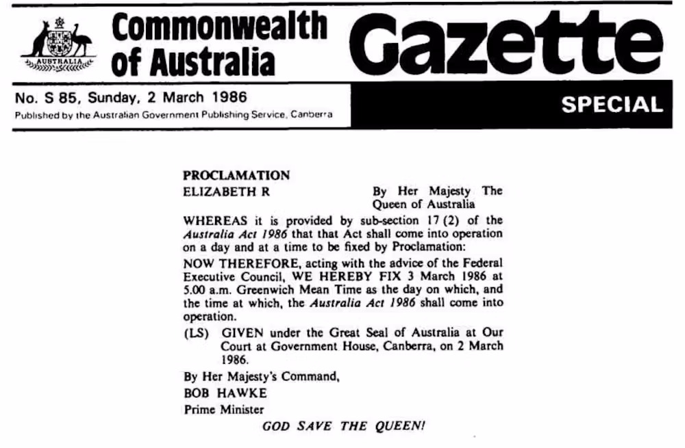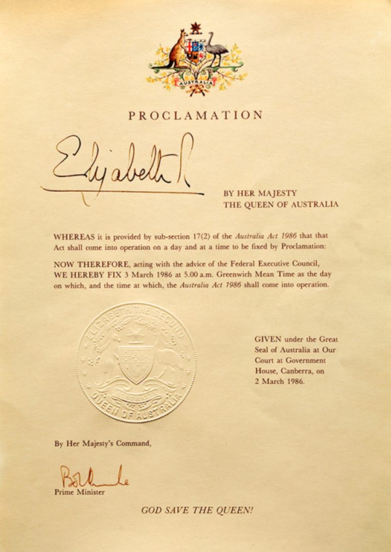 A proclamation signed by Queen Elizabeth II formally fixed 3 March 1986 as the date the Australia Acts came into operation. From that date, Australia’s legal and constitutional independence from Britain was complete.