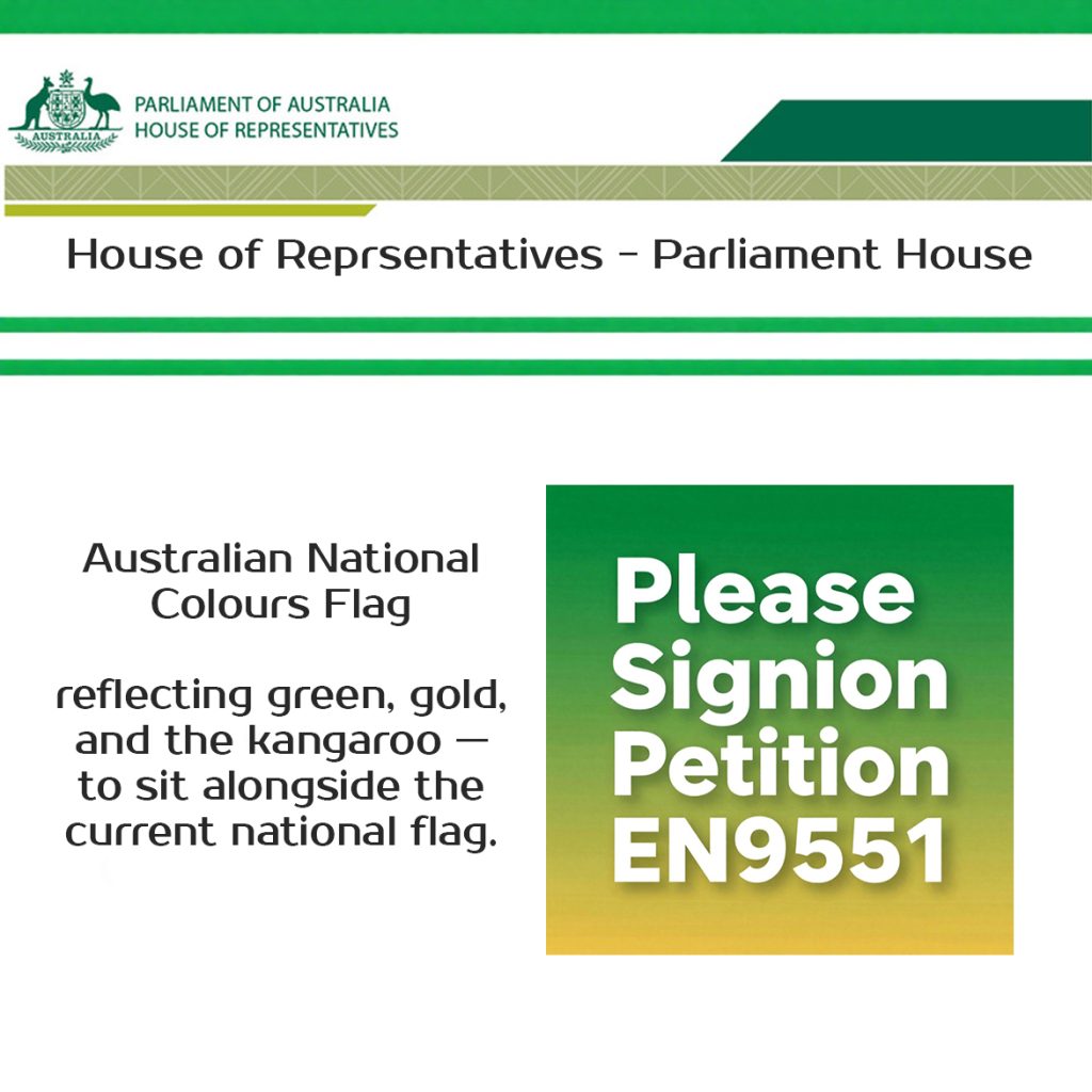 It asks Parliament to consider recognising an Australian National Colours Flag — reflecting green, gold, and the kangaroo — to sit alongside the current national flag.